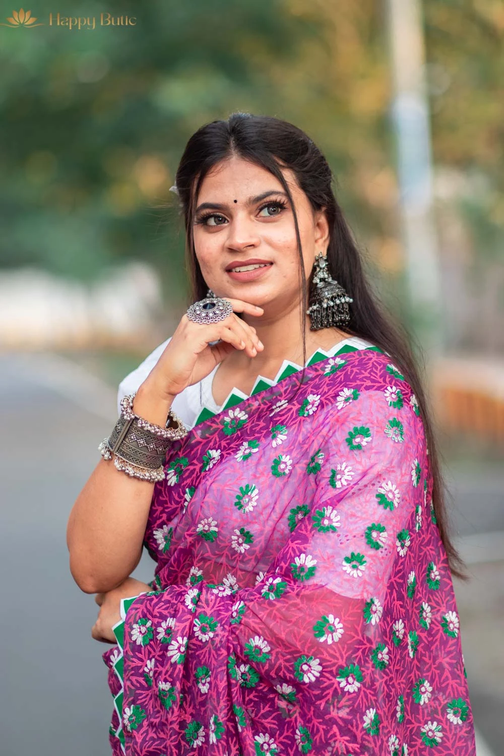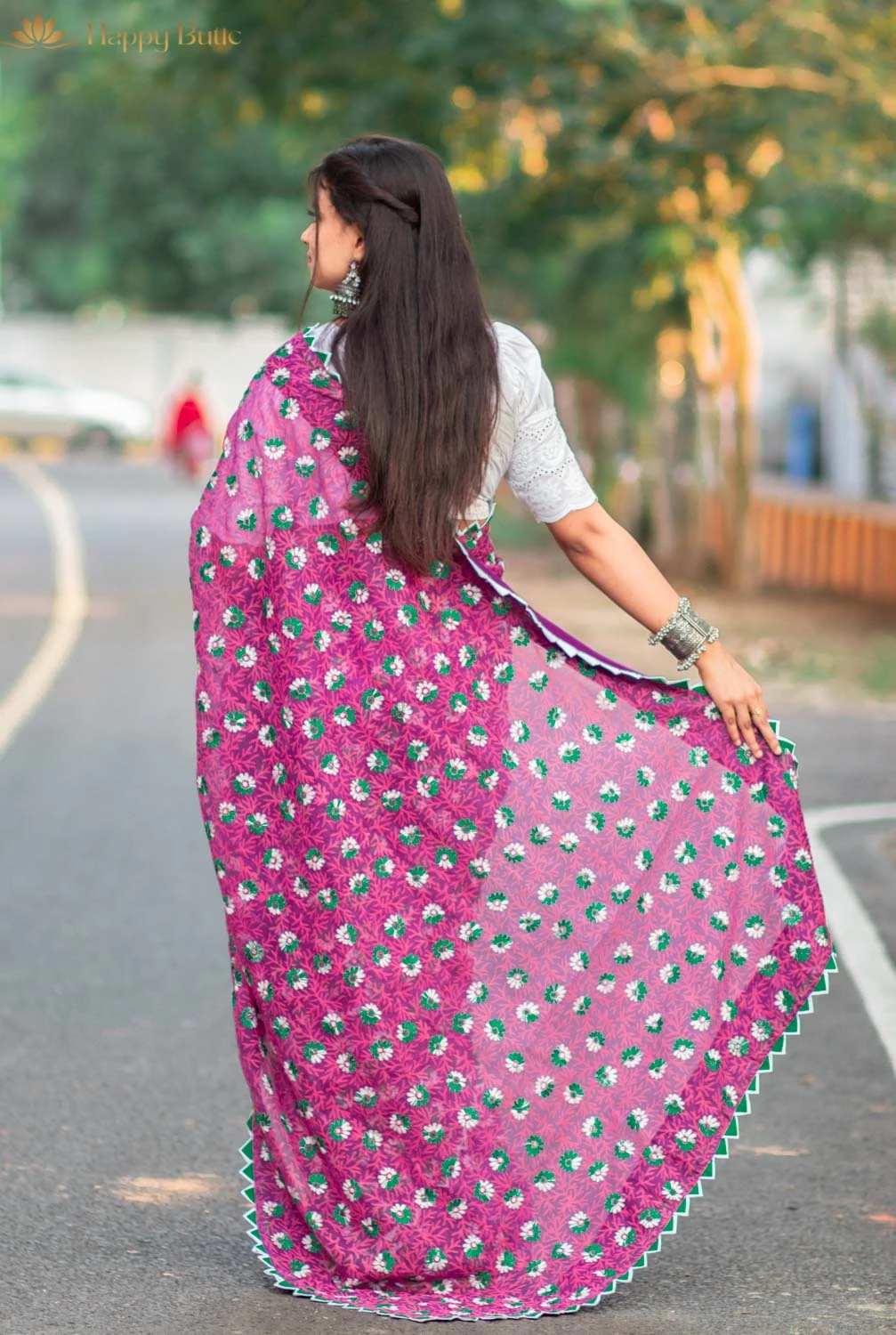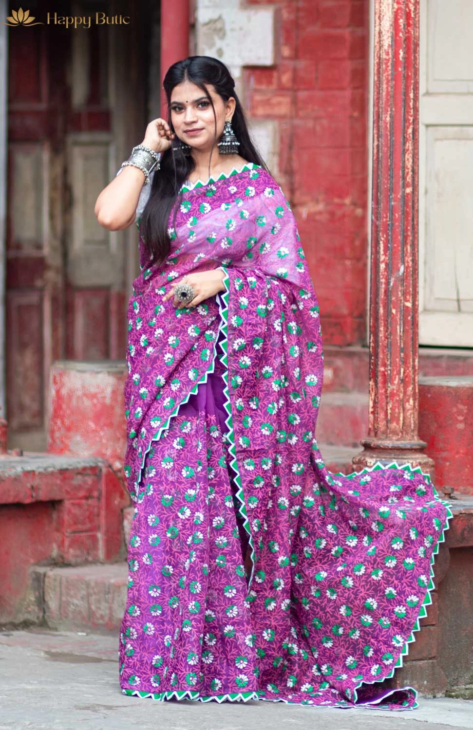The Hajari Phool Design Muslin Saree with Blouse by Happy Butic is a floral masterpiece crafted from pure muslin. With its delicate flower motifs spread across the saree, this lightweight and soft attire exudes elegance and charm. The saree comes with a matching blouse, adding to its convenience and complete appeal. Washable and breathable, it’s designed for both comfort and style.
