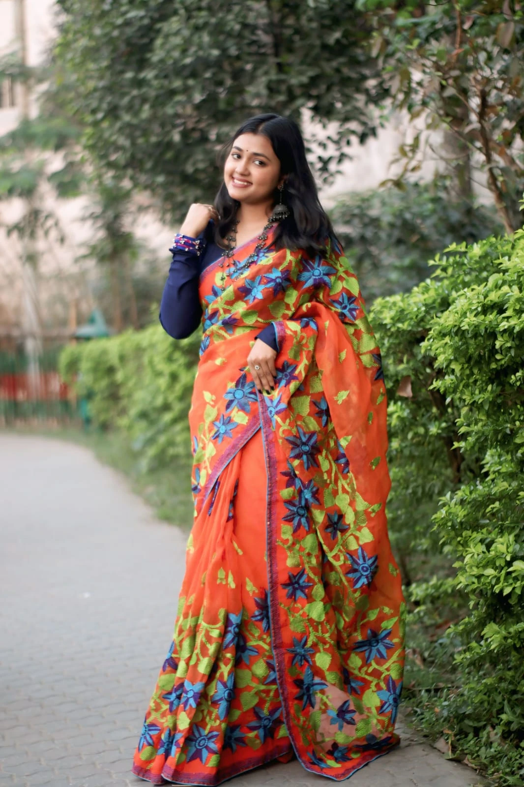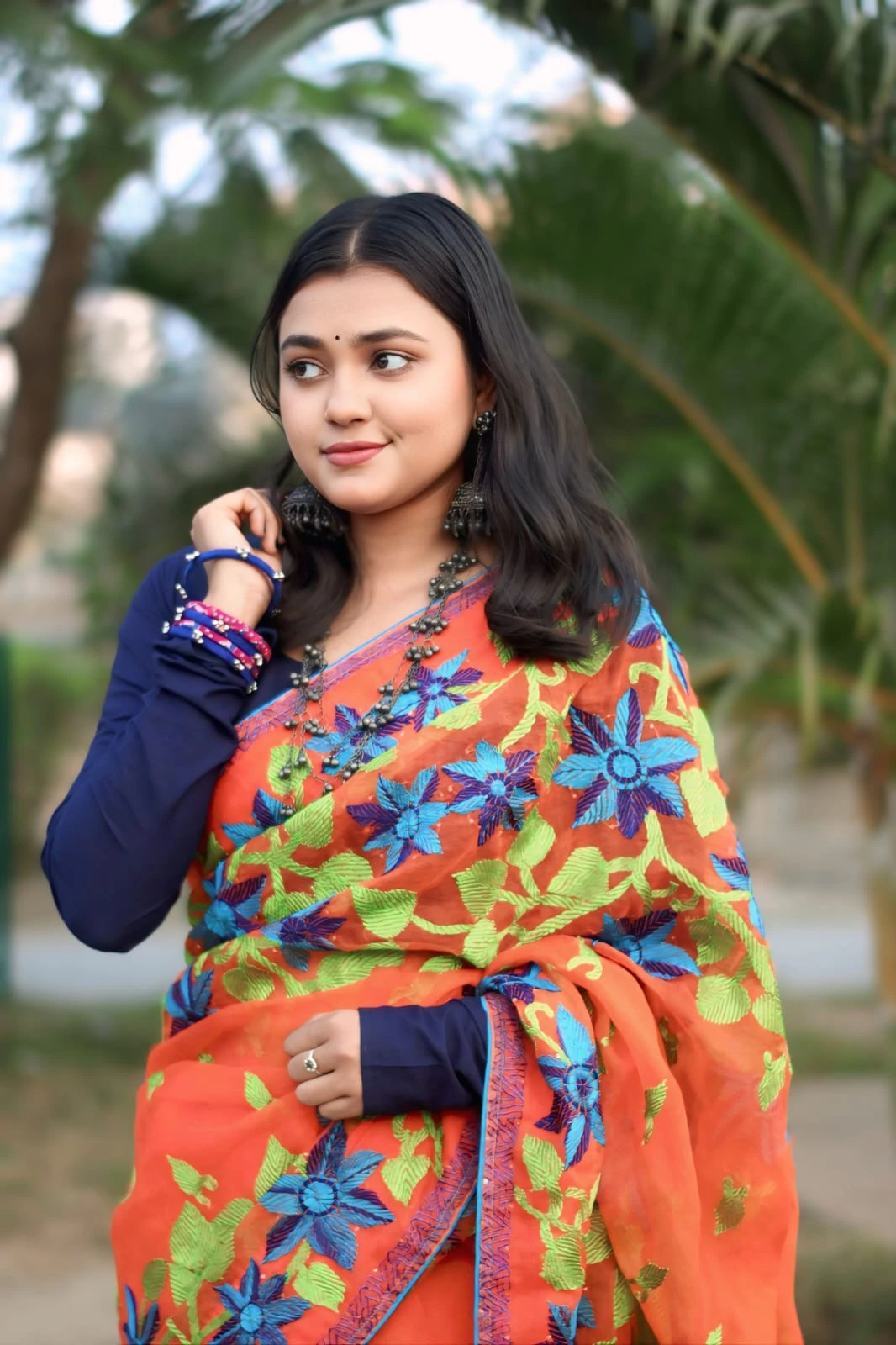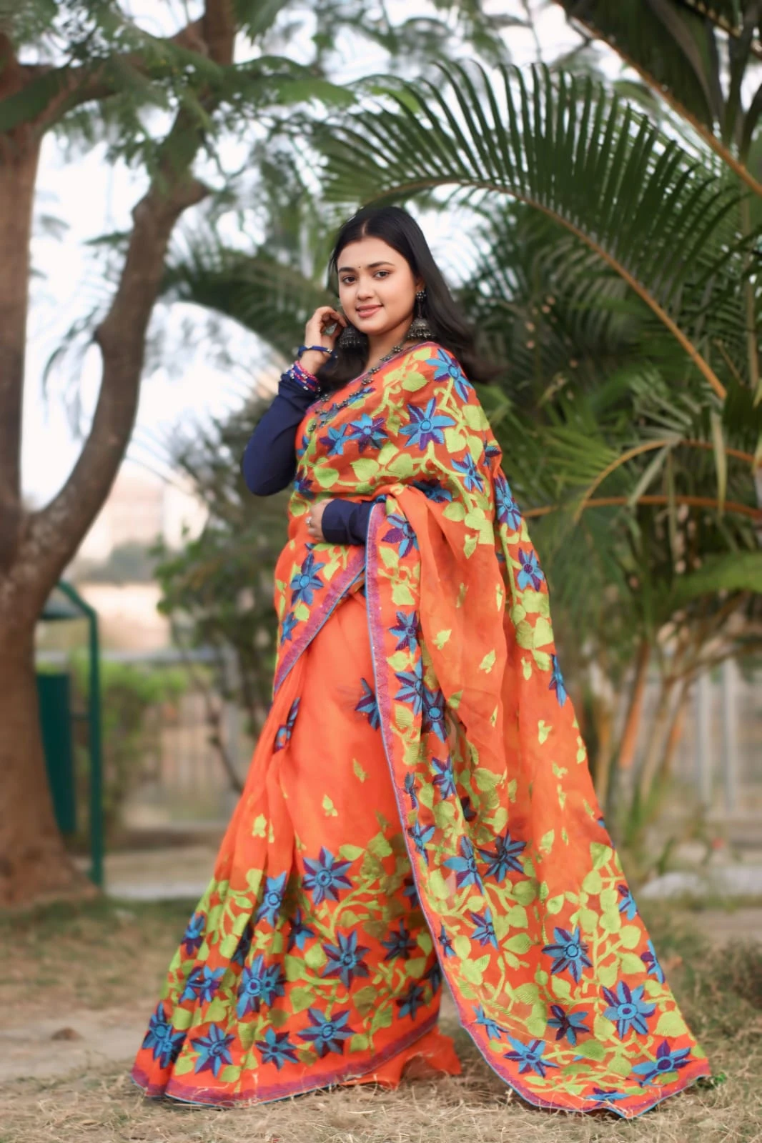 Step into timeless beauty with this Muslin Hand-Embroidered Saree, designed for sophistication and grace.